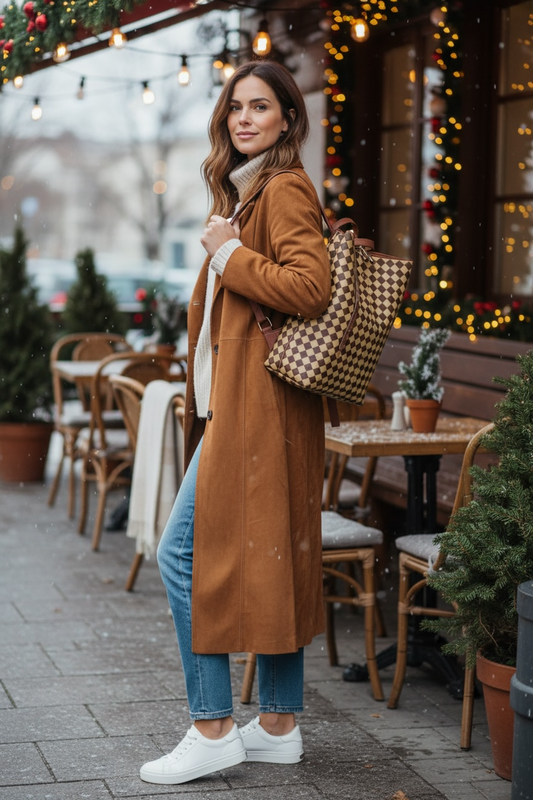 This design features a warm harlequin diamond pattern in mocha brown and cream evoking the coziness of a coffee house in a geometric, balanced rhythm. Classic and refined - a perfect accent to a capsule wardrobe.