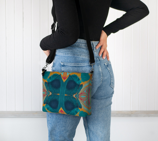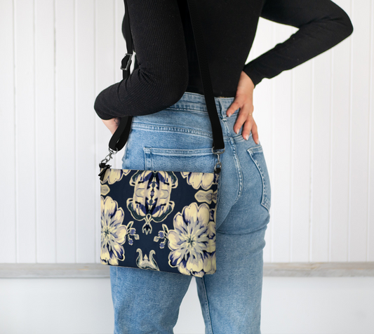 Blue Fleur Damask Vegan Leather Crossbody Bag
