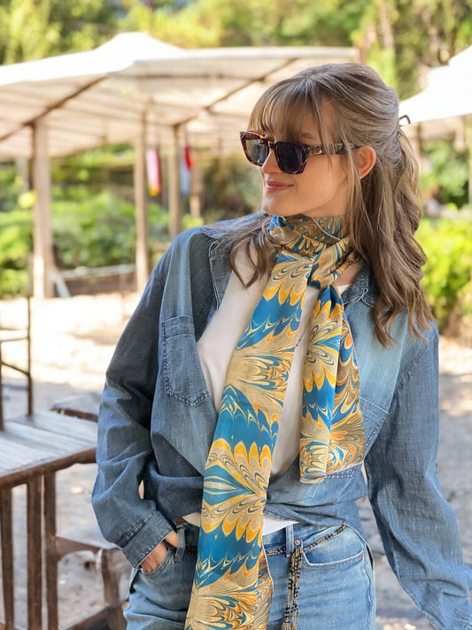 Prussian Blue Swirl Silk Long Scarf