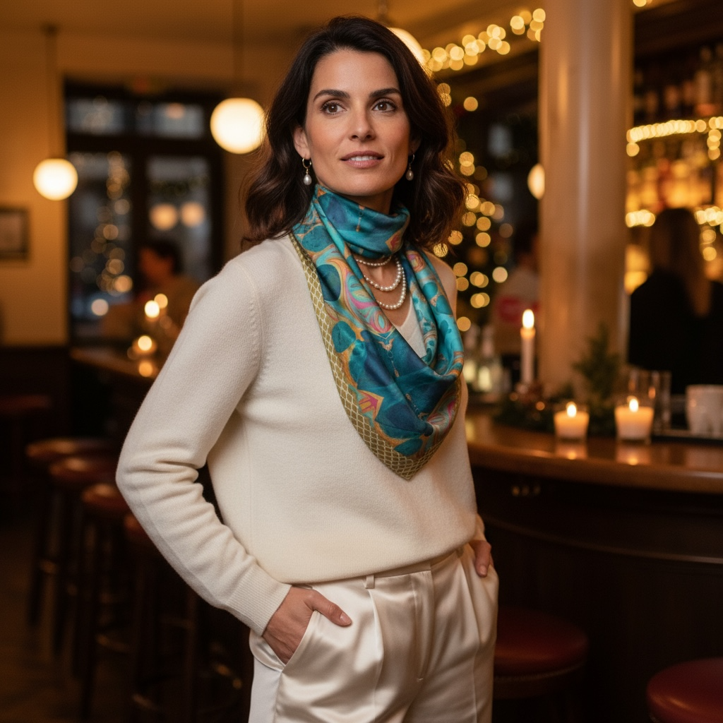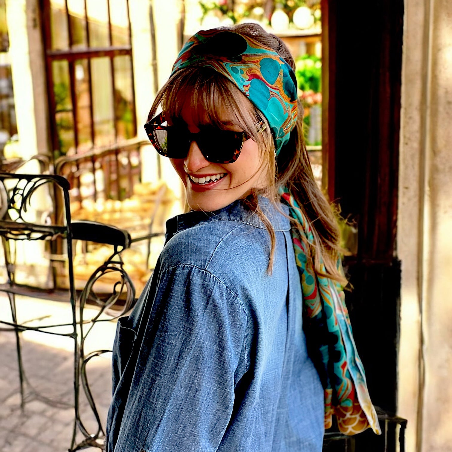 Wrap yourself in a brushstroke of elegance. Whether styled as a headscarf, neck tie, or draped over the shoulders, it’s a wearable canvas designed for the modern muse.
