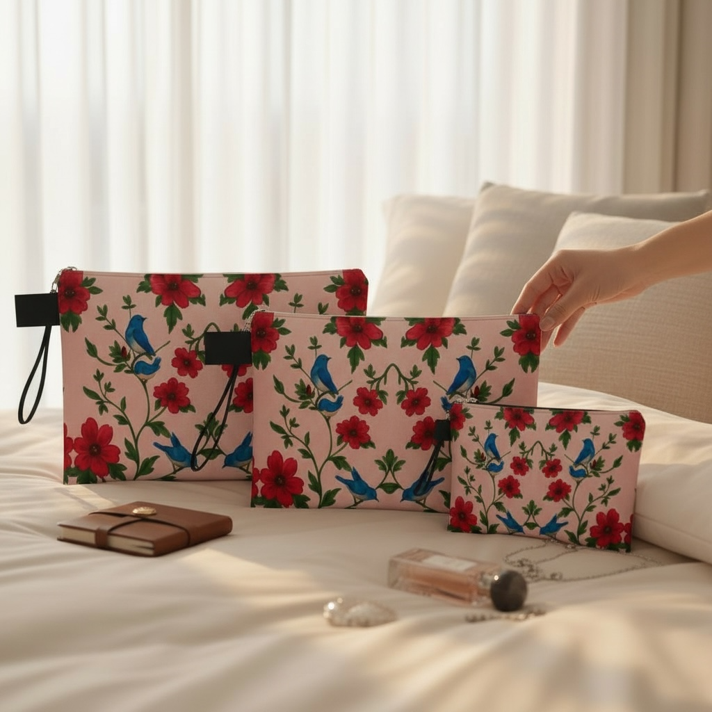 Carry-all zipper pouches featuring printed artwork. Denim-lined carry-alls come in 3 handy sizes to make toting and organizing almost anything effortless whether you're traveling or using these inside your totes or backpacks.